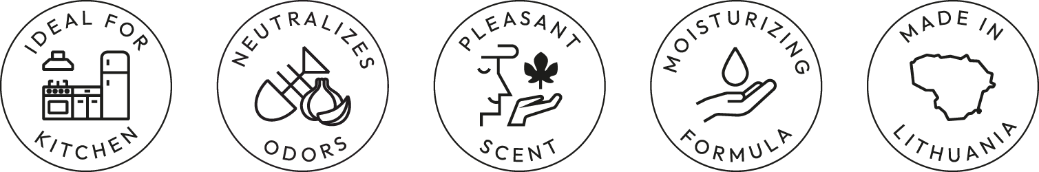 Šīs mitrinošās virtuves roku ziepes ir īpaši izstrādātas, lai neitralizētu smakas un maigi attīrītu rokas. Iedvesmojoties no svaigā un smalkā vīģes aromāta, kuru esat jau tā iemīlējuši. Tas atstāj maigu, nomierinošu un dabisku sajūtu uz jūsu rokām. Pateicoties savam īpašajam sastāvam, šīs ziepes ir lieliski piemērotas, lai noņemtu nepatīkamas smakas, kas palikušas, piemēram, pēc gatavošanas, ķiploku, sīpolu vai zivju griešanas.
